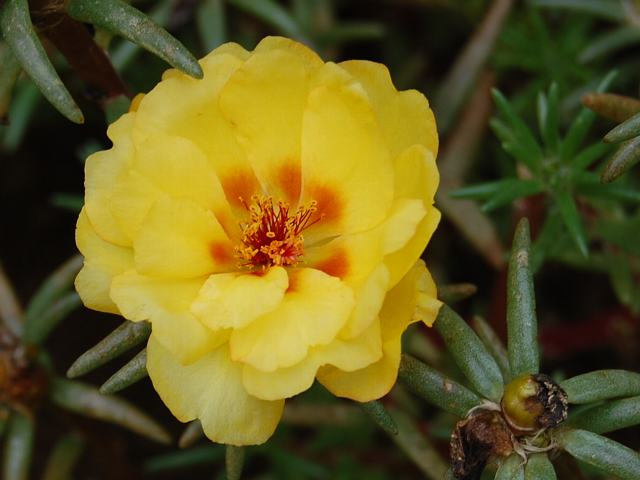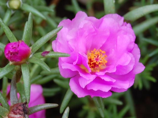 松葉牡丹(マツバボタン) 夏の花 2016年08月23日 松葉牡丹(マツバボタン)はスベリヒユ科スベリヒユ属(ポルチュラカ属)の一年草である。ポルチュラカ属は世界の温帯から熱帯にかけて137種が分布する。(Catalogue of Life: 2016 Annual Checklist より)また、多くの園芸品種が作出されている。本種の原産地はブラジル、アルゼンチン、ウルグアイである。英名はローズモス(rose moss)、モスローズ(moss rose)などである。日本へは江戸時代の末期に渡来した。庭植え、鉢植えとして観賞用に栽培されている。また、逸出したものが全国各地で野生化している。例えば北海道のブルーリストではBランク(北海道に定着している外来種)に選定されている。和名の由来は、葉が多肉質で「松」のように細く、花が「牡丹」に似るということからきている。草丈は10センチくらいである。茎は地を這って横に広がる。葉は線状の披針形(笹の葉のような形)で、先は鋭く尖る。葉は互い違いに生える(互生)が、茎先では輪生状となる。開花時期は6月から9月である。花の色には赤、桃色、白、黄色、橙色などがある。花径は3センチから6センチくらいで、一重咲きのものと八重咲きのものがある。一重咲きの場合の花弁数は5枚である。花は一日花だが、次々と花をつける。花の後にできる実はさく果(熟すると下部が裂け、種子が散布される果実)である。花言葉は「無邪気」「可憐」である。8月21日の誕生花である。属名の Portulaca はラテン語の「porta(入口)の縮小形である portula」からきている。果実は熟すと蓋がとれて口が開くことから名づけられた。種小名の grandiflora は「大きな花の」という意味である。写真は7月に神奈川県立フラワーセンター大船植物園で撮った。学名:Portulaca grandiflora(異名:Portulaca pilosa subsp. grandiflora)★むせ返る夏の陽射しも友にして 色も鮮やか松葉牡丹は☆夏の日の燃える思いはその花に 松葉牡丹の色とりどりに 花図鑑植物図鑑ミラーサイト|味の麺匠戸田久|おこめの鬼平|フロム蔵王|花の本屋さん|楽天トラベル|