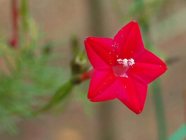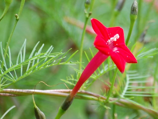 縷紅草(ルコウソウ) 夏の花 2016年08月31日 顔出した雄しべ愛しき縷紅草縷紅草(ルコウソウ)はヒルガオ科サツマイモ属(イポモエア属)の蔓性多年草である。イポモエア属は世界に500種以上が分布する。また、多くの園芸品種がある。薩摩芋(サツマイモ)が代表種で、属名の和名もサツマイモ属という。園芸的にはイポメア属の名が用いられることが多いが、これは属名を英語風に読んだものである。なお、本種は分類の仕方によってはルコウソウ属とされることもあるが、Catalogue of Life でも YList でもそれは異名の扱いとなっている。本種の原産地は、メキシコから南アメリカ大陸の北部である。英名はサイプレスバイン(cypress vine)である。サイプレスは糸杉(イトスギ)のことで、バインは蔓性の植物を指す言葉である。日本へは江戸時代の初期に渡来した。庭植え、鉢植えで支柱を立てるなどして観賞用に栽培されている。寒さに弱いので、園芸上は一年草として扱われる。和名の「縷」は糸を意味する言葉で葉の形状を表し、「紅」は花の色を表している。草丈は40センチから50センチくらいである。蔓の長さは1メートルから3メートルになる。葉は羽状に深く裂けて糸のように細かく、互い違いに生える(互生)。開花時期は8月から10月である。細い筒状で先が星状に浅く5つに裂けた真紅の花をつける。花径は2センチくらいである。花の後にできる実はさく果(熟すると下部が裂け、種子が散布される果実)である。近縁種に、葉に切れ込みがない丸葉縷紅草(マルバルコウソウ)がある。また、両者が交雑育成されたのが羽衣縷紅草(ハゴロモルコウソウ)である。俳句の季語は夏である。花言葉は「おせっかい」である。8月24日の誕生花である。属名の Ipomoea はギリシャ語の「ips(芋虫)+homoios(似た)」からきている。物に絡みついて這い登る性質からから名づけられた。種小名の quamoclit はギリシャ語の「kyamos(豆)+clitos(低い)」からきており、マメのように蔓性で背丈が低いという意味から名づけられた。写真は9月に東京都薬用植物園で撮った。学名:Ipomoea quamoclit(異名:Quamoclit vulgaris)★小さくも真っ赤に燃える縷紅草 陽射しに映えるパッションの色☆夏空に真紅の星は縷紅草 涼やかな葉は緑優しく花図鑑植物図鑑ミラーサイト|味の麺匠戸田久|おこめの鬼平|フロム蔵王|花の本屋さん|楽天トラベル| PR