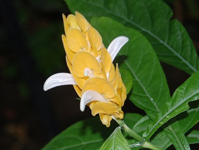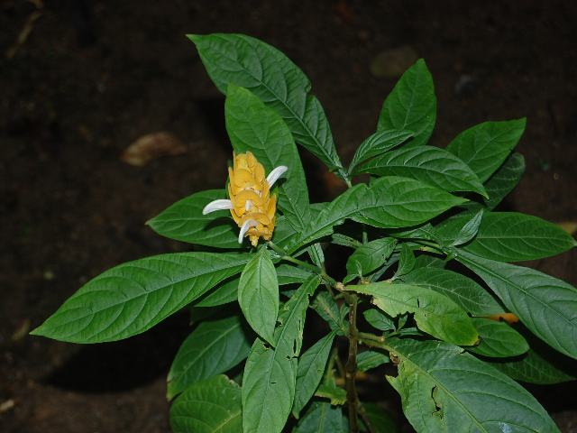 パキスタキス・ルテア 四季の花 2016年08月10日 パキスタキス・ルテアはキツネノマゴ科パキスタキス属の常緑小低木である。パキスタキス属は中南アメリカ、西インド諸島に12種が分布する。(Catalogue of Life: 2016 Annual Checklist より)同属のパキスタキス・コッキネアに紅珊瑚花(ベニサンゴバナ)の和名があり、属名の和名をベニサンゴバナ属とするものもある。本種の原産地も中南アメリカ、西インド諸島である。YListでは和名を鬱金珊瑚花(ウコンサンゴバナ)としている。英名はロリポッププラント(lollipop plant)やゴールデンシュリンプ(golden shrimp)である。日本へは戦後に渡来した。日本では鉢植えとして栽培される。樹高は90センチから120センチくらいである。葉は長い楕円形で、向かい合って生える(対生)。開花時期は5月から11月である。温度さえ合えば周年開花をする。茎先に黄色い苞(葉の変形したもの)を重なるようにつけ、その先に白い舌状の花が垂れ下がるようにつく。苞は花の咲かない時期にも残る。花の後にできる実はさく果(熟すると下部が裂け、種子が散布される果実)である。花言葉は「美しい娘」である。8月11日の誕生花である。属名の Pachystachys はギリシャ語の「pachys(太い)+stachys(穂)」からきている。種小名の lutea は「黄色の」という意味である。写真は9月に京都府立植物園の温室で撮った。学名:Pachystachys lutea★温室の定番なれどパキスタキス 苞と花とがバランス保ち☆デザートの飾りを思わす花姿 パキスタキスの不思議な魅力花図鑑植物図鑑ミラーサイト|味の麺匠戸田久|おこめの鬼平|フロム蔵王|花の本屋さん|楽天トラベル|
