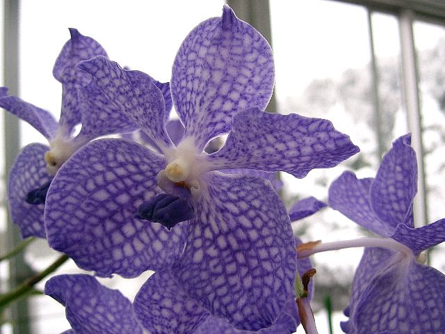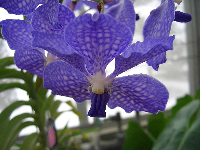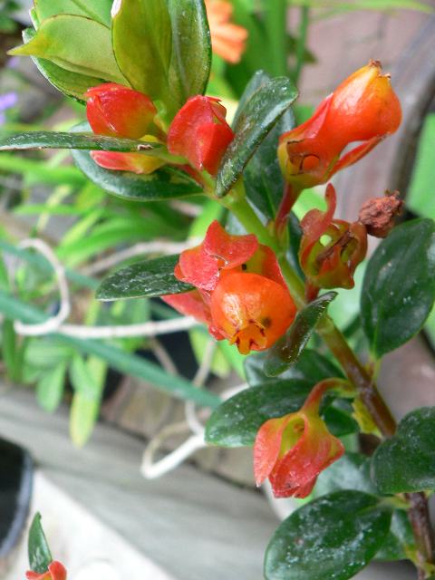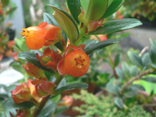 葉の脇に1つずつつく花はオレンジ色の壺形である。