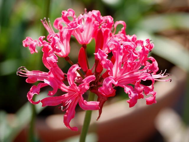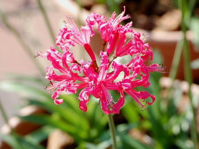 ネリネ 秋の花 2016年10月17日 ネリネはヒガンバナ科ネリネ属の多年草の総称である。ネリネ属は南アフリカに30種が分布する。(Catalogue of Life: 2016 Annual Checklist より)また多くの園芸品種があり、主にイギリスで品種改良をされた。日本へは大正時代の末期に渡来した。英名をダイアモンドリリー(diamond lily)という。彼岸花(ヒガンバナ)に似ているが花茎が中空ではなく、花もやや小さい。また、花が咲くときに葉も出ている。草丈は30センチから50センチくらいである。葉は線形で、翌年の初夏まで残る。開花時期は10月から12月である。1本の茎に10輪くらいの花がつく。花びら(花被片)には艶があり、花径は5、6センチくらいである。花の色は白、ピンク、赤、朱色などがある。 花もちがよく、切り花などによく使われる。花言葉は「また会う日まで」である。10月17日の誕生花である。属名の Nerine はギリシャ神話の海の女神「ネレイス(Nereis)」からきている。写真は11月に神奈川県立フラワーセンター大船植物園で撮った。学名:Nerine spp.★すっと立つネリネの花は色づいて 北の風にもひるむことなく☆花びらはダイヤモンドの輝きに 劣らぬ心君へ届けと花図鑑植物図鑑ミラーサイト|味の麺匠戸田久|おこめの鬼平|フロム蔵王|花の本屋さん|楽天トラベル|