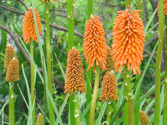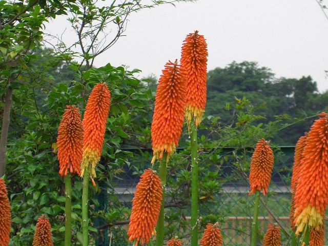 トリトマ 秋の花 2016年10月17日 トリトマ(Tritoma)はユリ科シャグマユリ属(クニフォフィア属)の多年草である。分類体系によっては(APG第3版)ススキノキ科とされる。クニフォフィア属はアフリカに72種が分布する。(Catalogue of Life: 2016 Annual Checklist より)本種の原産地は南アフリカのケープ地方である。トリトマというのは旧属名だが、園芸的にはこの名で流通している。英名はトーチリリー(torch lily)という。日本へは明治時代の中期に渡来した。庭植えにされるほか、切り花としても利用される。和名は赤熊百合(シャグマユリ)という。「赤熊」は元来は赤く染めたヤクの尾の毛のことで、兜飾りなどに用いられた。別名を大トリトマ(オオトリトマ)という。開花時期は6月から10月である。草丈は60センチから120センチくらいである。根際から生える葉は剣状である。長い花茎の上部に、筒状の花を穂状につける。花は先が小さく6つに裂けていて下向きに密生し、下から咲きあがる。蕾のうちは紅色で咲き進むと黄色になるので、上部が紅色、下部が黄色に見える。小形の姫トリトマ(ヒメトリトマ:Kniphofia triangularis)との交雑で多くの園芸品種が生まれている。そうしたものには、白、オレンジ、ピンク、赤などのものがある。花の後にできる実はさく果(熟すると下部が裂け、種子が散布される果実)である。花言葉は「恋するつらさ」である。10月9日の誕生花である。属名の Kniphofia はドイツの植物学者「クニフォフ(Johann Hieronymus Kniphof, 1704-1763)さん」の名からきている。種小名の uvaria は「(バンレイシ科の)ウバリア属の」という意味である。写真は7月に野田市の清水公園で撮った。学名:Kniphofia uvaria★夏空をめざし元気に咲き昇る トーチリリーの花は爽やか☆夏空にはえる姿は恋の色 トーチリリーの炎燃やせば花図鑑植物図鑑ミラーサイト|味の麺匠戸田久|おこめの鬼平|フロム蔵王|花の本屋さん|楽天トラベル|